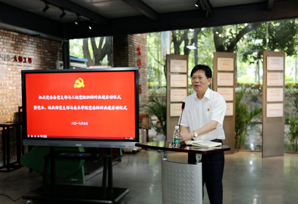 为深入学习贯彻习近平新时代中国特色社会主义思想,探索创新基层党建工作形式,全面提升基层党组织组织力,充分发挥基层党组织战斗堡垒作用,5月24日,机关党委在非遗大师工坊开展了与二级党组织结对共建启动仪式暨党办、统战部党支部与美术学院党委结对共建启动仪式。学校党委书记凌靖波,党委办公室(与统战部合署)兼机关党委、党委组织部、党委宣传部、党委学生工作部主要负责人,机关党委各党支部书记,美术学院党政领导班子成员及有关党员、教师、学生参加启动仪式。仪式由美术学院党委书记苏敏主持。
