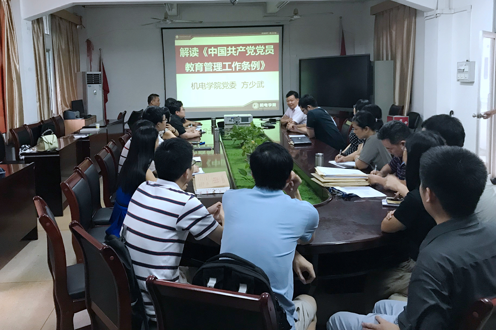 为深入学习贯彻《中国共产党党员教育管理工作条例》,加强基层党组织建设和党员教育管理工作,7月11日,机电学院党委召开全体教师党员大会,认真组织党员学习条例内容和有关精神。会上,机电学院党委负责人方少武为大家上了《解读<中国共产党党员教育管理工作条例>》的党课,从《条例》出台的背景和意义、党员教育管理工作的原则、学习贯彻习近平新时代中国特色社会主义思想、党员教育的基本任务、党员日常教育管理主要方式、党籍和党员组织关系管理、党员监督和组织处置、流动党员管理、党员教育管理信息化、组织领导和工作保障等10个方面作了全面的解读。