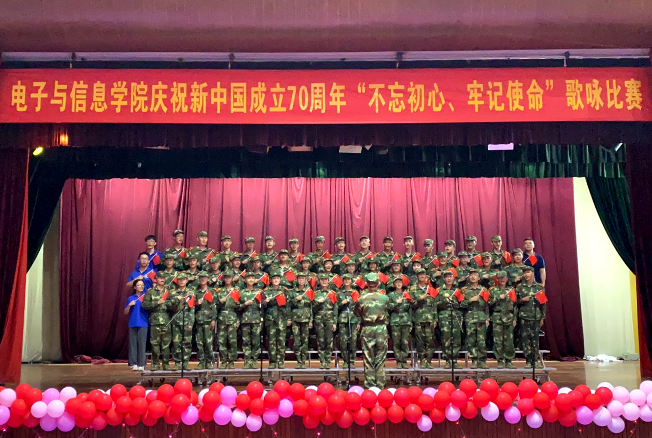 9月28日,电子与信息学院在东校区综合馆三楼举行庆祝新中国成立70周年“不忘初心、牢记使命”歌咏比赛。学生工作部部长郭磊、电子与信息学院领导班子成员、承训教官代表、辅导员班主任和2019级全体学生400多人参加了活动。