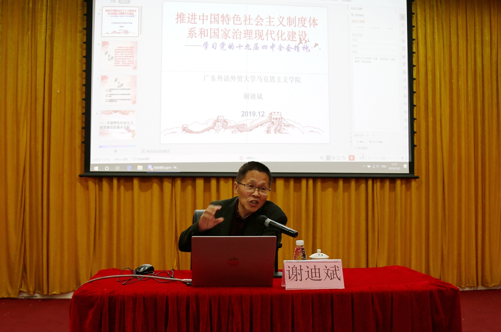 谢迪斌以《推进中国特色社会主义制度体系和国家治理现代化》建设为主题,详细介绍了推进中国特色社会主义制度体系和国家治理体系现代化建设的意义、背景,深入分析了中国特色社会主义制度建设的基本目标。他指出,权力体系现代化、民主治理现代化和公共服务现代化是推动中国特色社会主义制度体系和国家治理体系现代化的基本举措和基本内容。他认为,党的十九届四中全会是在庆祝新中国成立70周年的重要节点,向全面建成小康社会、实现第一个百年奋斗目标迈进的关键之年召开的一次重要会议。全会充分肯定我们党治理国家取得的历史性成就,全面总结我国国家制度和国家治理体系的显著优势,明确了加强和完善国家治理必须坚持的基本原则以及总体目标、工作要求,为坚定制度自信、实现伟大梦想提供了根本遵循,指明了正确方向。