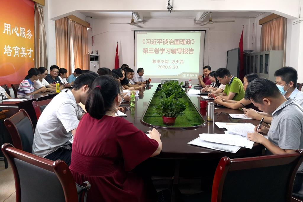 为贯彻落实学校党委《关于开展<习近平谈治国理政>第三卷专题学习培训工工作的通知》要求,以习近平新时代中国特色社会主义思想武装全体党员,不断提高党员的党性修养水平,9月24日,机电学院党委在西校区举办《习近平谈治国理政》第三卷学习报告会。机电学院党政领导班子、全体党支部书记和教工党员共40余人参加学习。