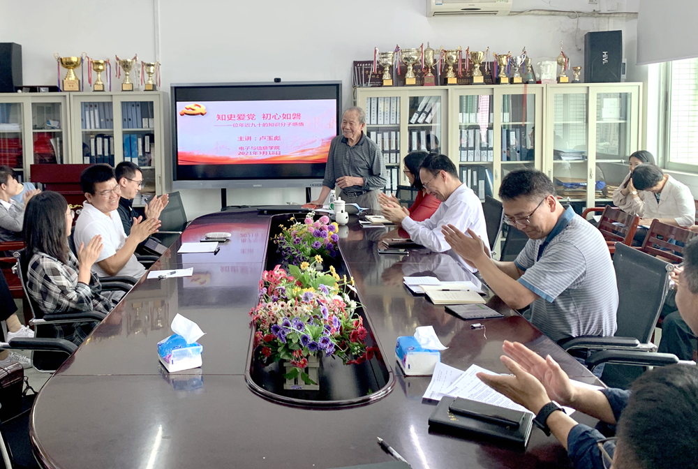 3月18日下午,电子与信息学院“学党史•砺初心•谋发展——党史学习教育每周一讲”活动第三讲在东校区一教1312会议室举行。2020年“广东好人”获得者、学校关工委卢玉彪副教授应邀作了题为《知史爱党、初心如磐——一位年近九十的知识分子感悟》的党课,电子与信息学院全体教职工参加了此次党课。党课由学院党委书记罗旭辉主持。