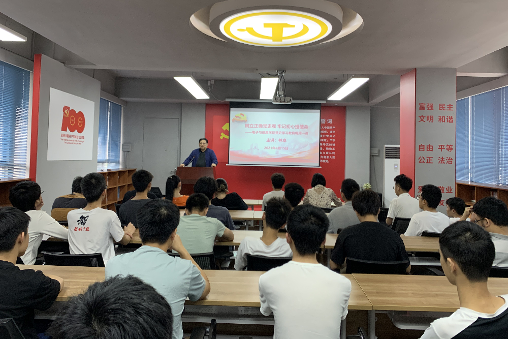 4月15日,电子与信息学院在东校区初心斋举行了“学党史•励初心•谋发展”党史学习教育第七讲,邀请校关工委常务副主任、原副校长林卓同志讲授专题党课,学院学生党员和入党积极分子代表共70余人参加此次党课,此次党课由电子与信息学院党委副书记梁茵主持。