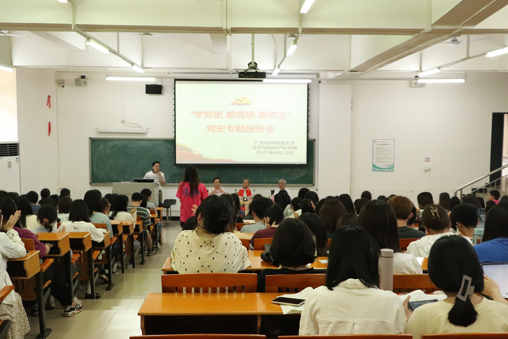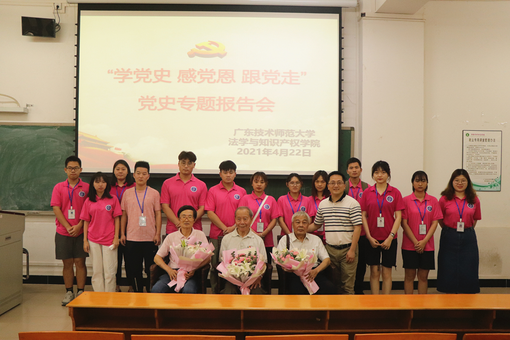 为营造浓厚的党史学习教育氛围,推动党史学习教育往深里走、往心里走、往实里走,4月22日下午,法学与知识产权学院在白云校区三教107举办“学党史、感党恩、跟党走”党史专题报告会。本次报告会特别邀请了关工委卢玉彪、张善荣、吴炳根三位老同志作专题报告,报告会由学院党委副书记李雪斌主持,220余名学生党员干部、学生代表参加活动。