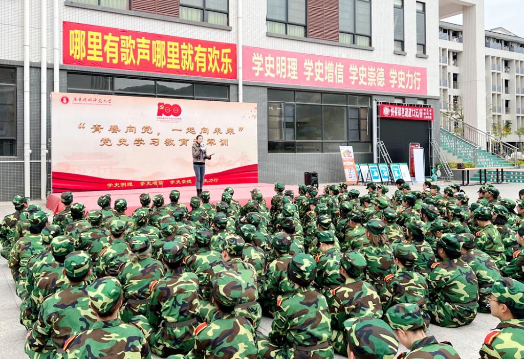 为扎实推进党史学习教育,促进军训教育与党史学习教育深度融合,近日,文学与传媒学院依托“小红粉”网络思政工作室,利用军训场景优势,将训练场变成鲜活的党史学习教育大课堂,以“青春向党,一起向未来”为主题,结合学院学科特点,开展系列特色鲜明、形式多样、实效导向的党史学习教育,帮助学生深刻认识和了解中国共产党百年奋斗的光辉历程,坚定理想信念,厚植爱党爱国情怀。