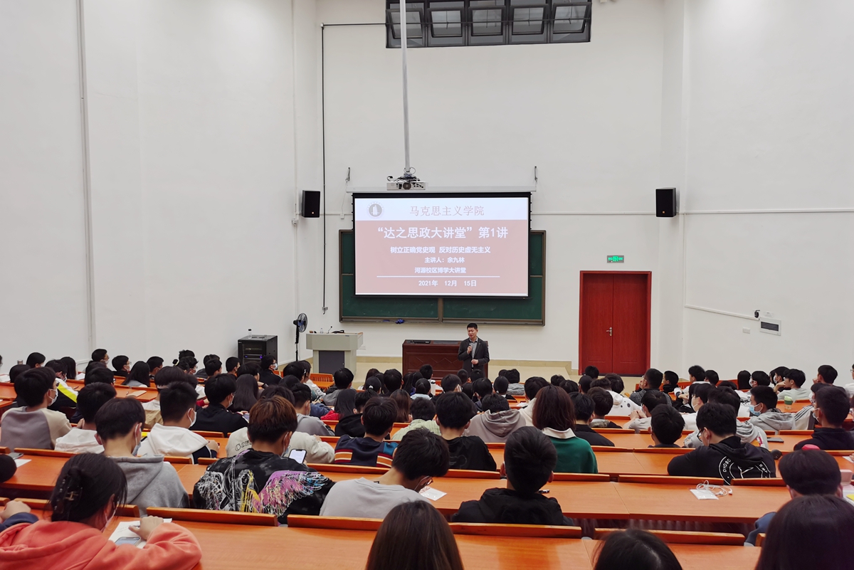 12月15日,马克思主义学院“达之思政大讲堂”第一讲在河源校区大讲堂205顺利开讲。学院硕士生导师余九林博士以《树立正确党史观 反对历史虚无主义》为题,讲授了一堂“党史”大思政课。学校百余名师生参与讲座,现场气氛热烈,讲座取得了良好的效果。