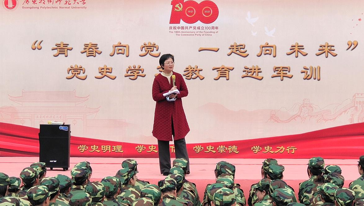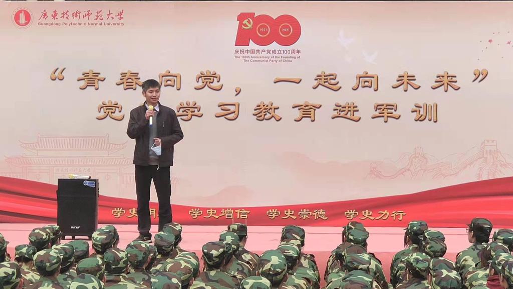 白雪飞以“党史学习教育进军训”作为切入点,引导学生们赓续红色基因,勇担时代使命;接着以“搬砖”的典故勉励同学们即使身处逆境,也要保持积极乐观的心态,锻炼身体、韬光养晦,无论是学习、生活还是工作,都要学会规范自己的行为,严于律己,宽以待人。白雪飞对参训同学提出殷切期望,希望同学们学会在担当中历练、在尽责中成长,学党史、强信念、跟党走,以“强国有我”的姿态自觉奋进新征程。