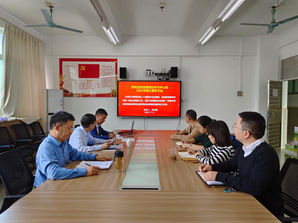 11月5日下午,研究生院党委理论学习中心组举行2025年第三期学习会,专题学习党的二十届四中全会精神。研究生院领导班子和各科室负责人参加学习会。会议由党委书记姚洪略主持。