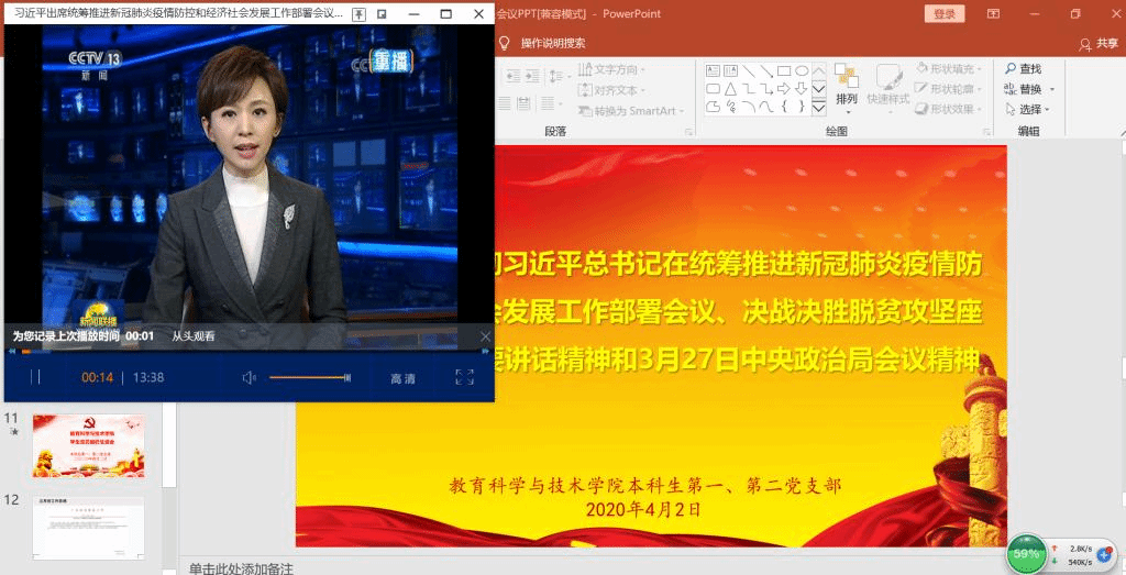 根据学校党委2020年党建工作会议精神和学院党委疫情防控工作部署,4月2日,教育科学与技术学院本科生第一、第二党支部联合举行学习研讨会,深入学习贯彻习近平总书记在统筹推进新冠肺炎疫情防控和经济社会发展工作部署会议、决战决胜脱贫攻坚座谈会和3月27日中央政治局会议等系列重要讲话精神。受疫情影响,会议通过腾讯会议在线进行,支部书记、辅导员吴晨阳老师主持视频会议,全体学生党员参加研讨会。