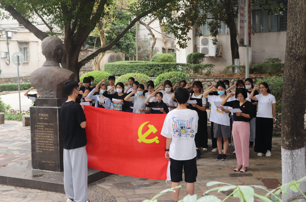 王明粤带领学生党员重温入党誓词。她表达了对罗明同志的崇高敬意,要求学生党员和入党积极分子学习罗明同志刻苦上进、艰苦奋斗、对党忠诚、不屈不挠的革命精神和为革命事业奋斗终身的共产主义信念,努力成为有理想、有本领和有担当的时代新人。